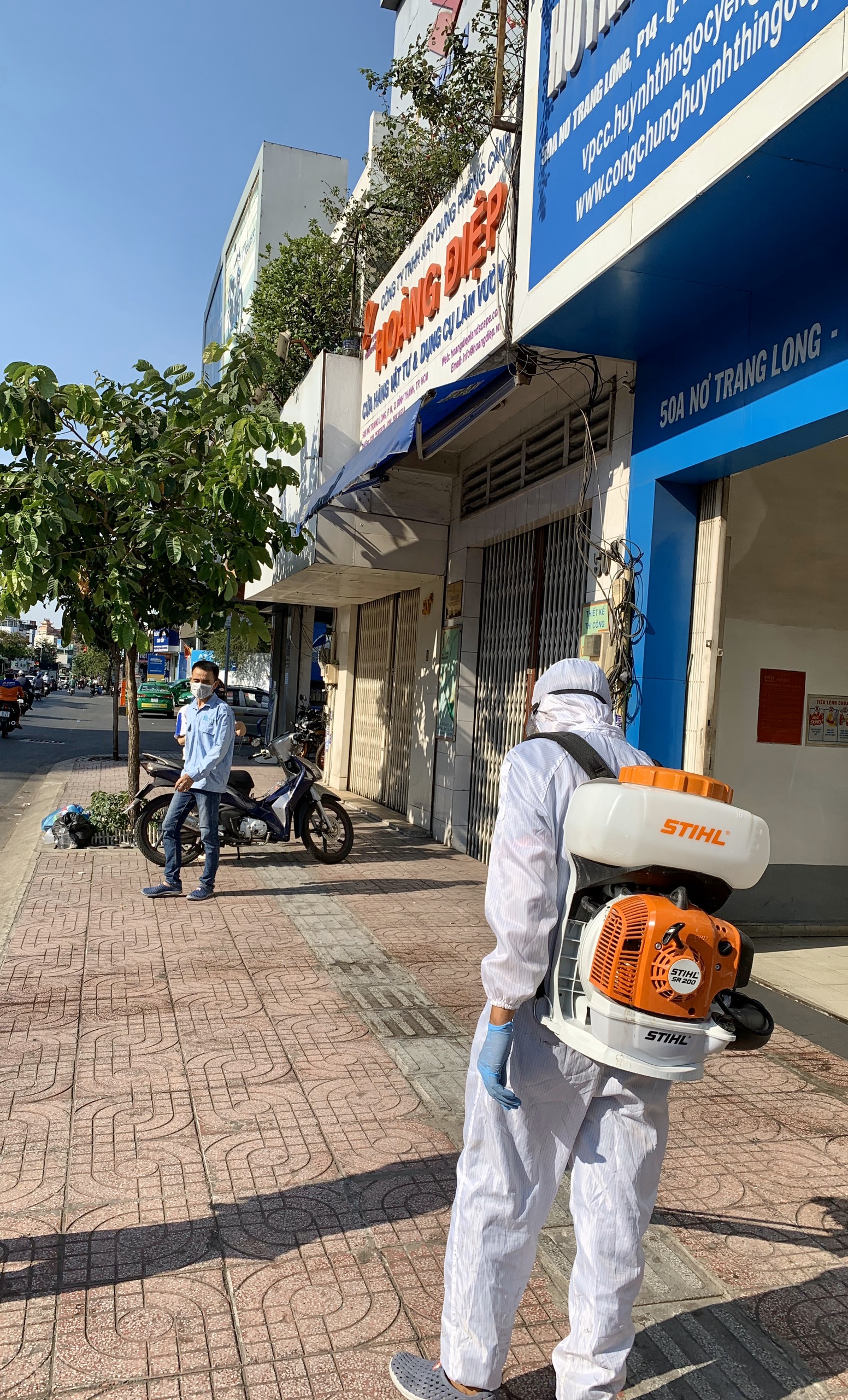 Phun thuốc khử trùng khu vực trước Văn phòng